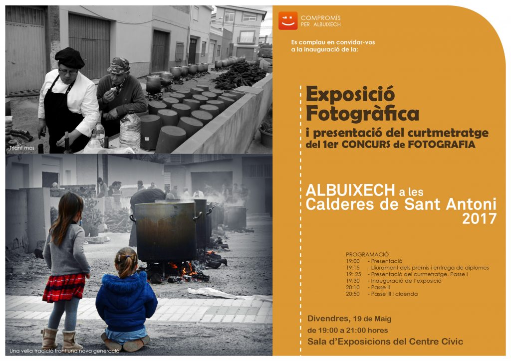 Compromís per Albuixech es complau en convidar-vos a la inauguració de l’Exposició Fotogràfica i presentació del curtmetratge “Albuixech a les Calderes de Sant Antoni 2017” que recull les obres seleccionades al 1er concurs fotogràfic organitzat pel grup municipal de Compromís, i que tindrà lloc el divendres dia 19 de maig de 19:00 a 21:00 hores, a la Sala d’Exposicions del Centre Cívic.